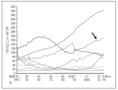 問題  2 図は、厚生労働省令和元年人口動態月報年計による「主な死因別にみた死亡率(人口 10 万対)の年次推移」である。